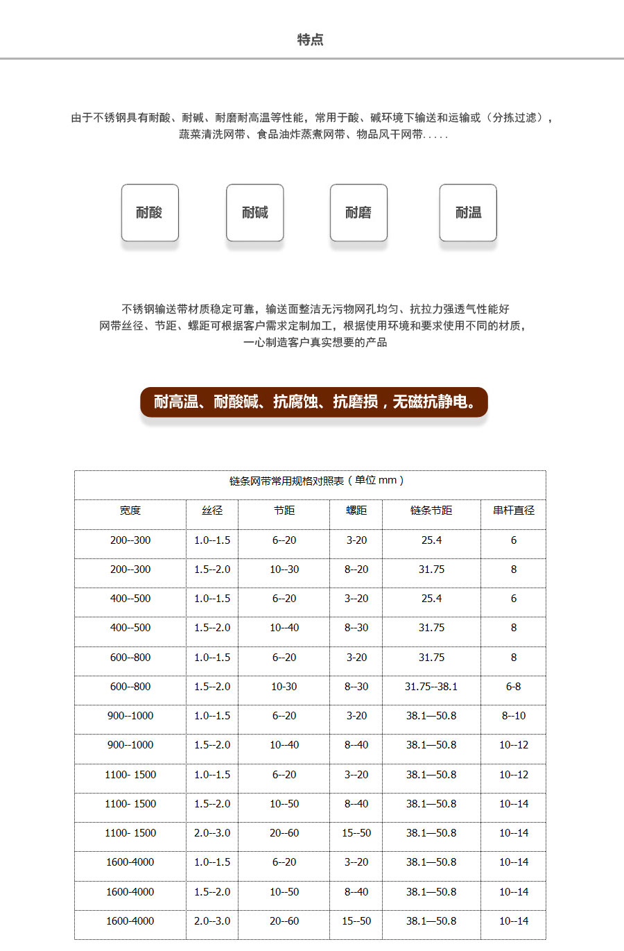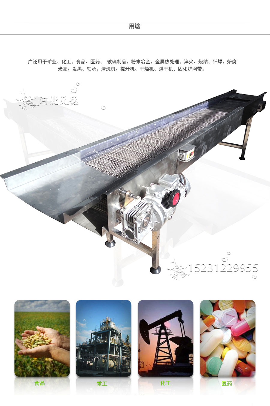 廣泛用于玻璃制品行業(yè)的退火爐網(wǎng)帶、烤花爐網(wǎng)帶等。食品加工行業(yè)、脫水蔬菜、速凍食品單凍機前處理網(wǎng)帶、鏈網(wǎng)。粉末冶金、金屬熱處理、淬火、燒結、釬焊、焙燒、光亮、發(fā)黑、軸承、滲碳高溫爐網(wǎng)帶、擋板式網(wǎng)帶、涂裝烘干線輸送網(wǎng)帶、泡沫鎳還原生產(chǎn)線網(wǎng)帶,清洗機、提升機、干燥機、烘干機、固化爐網(wǎng)帶。
